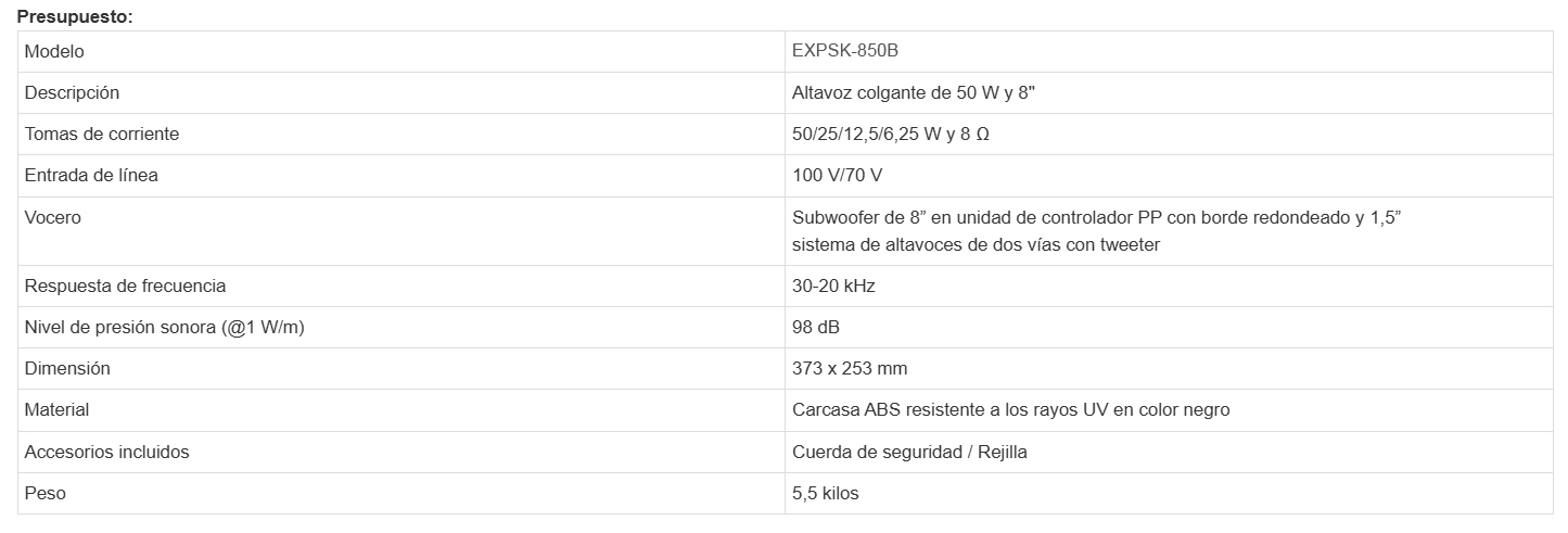 Altavoz colgante de 50 W y 8″, sistema de altavoces de dos vías con subwoofer de 8″ y tweeter de 1,5″. Aplicaciones en interiores: restaurantes, oficinas, auditorios, gimnasios y centros comerciales.